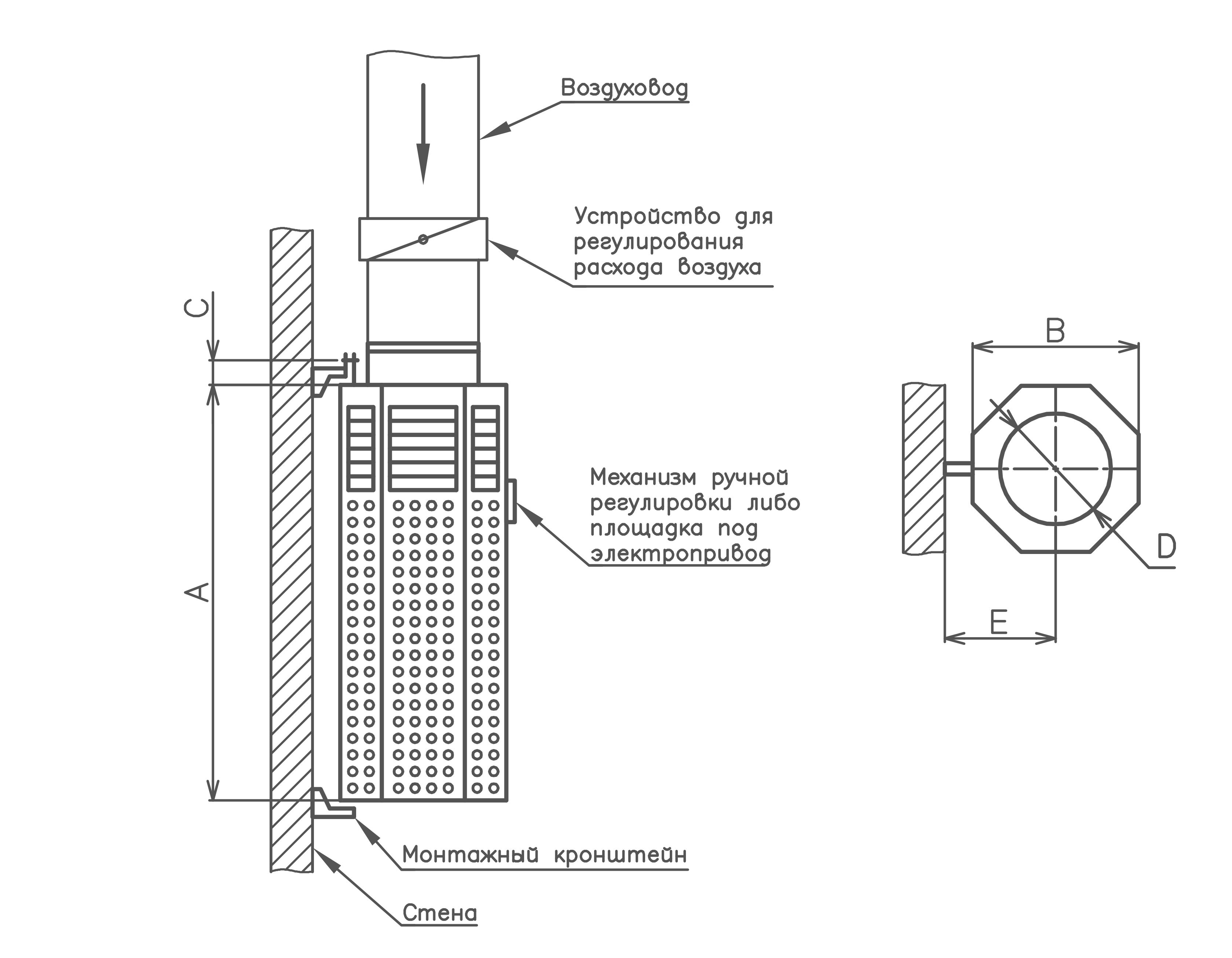 Монтаж воздухораспределителя ВНМ осуществляется при помощи кронштейнов к стене. Кронштейны входят в комплект поставки.